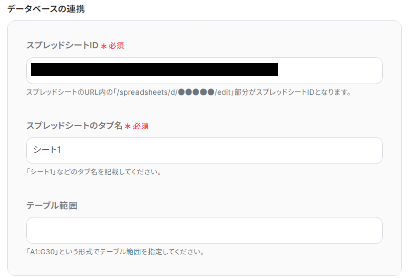 ※Googleスプレッドシートのテーブル範囲の定義についてはこちらをご参照ください。https://intercom.help/yoom/ja/articles/8703465
