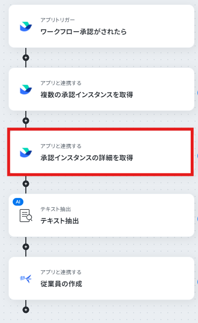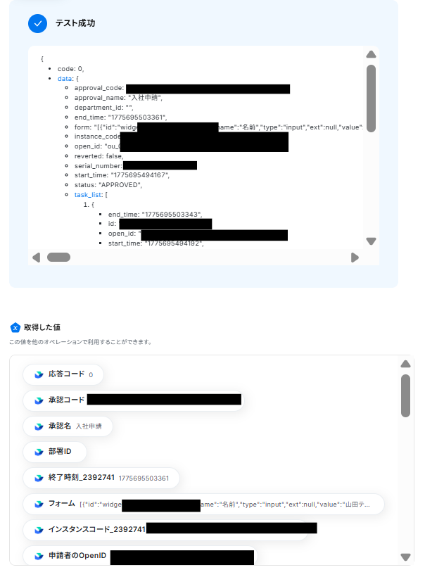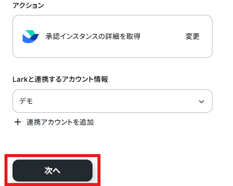 - 次に、Larkの「承認インスタンスの詳細を取得」アクションで、承認内容の詳細データを取得します。
