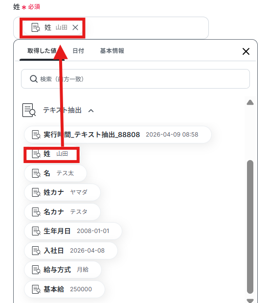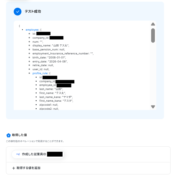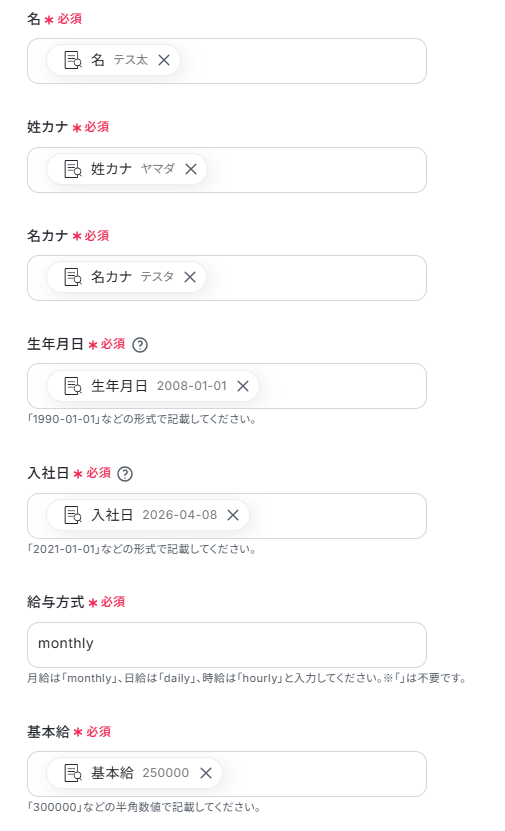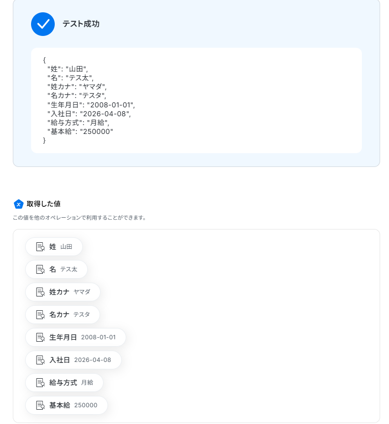 - freee人事労務では、前段で取得した値を、従業員情報のどの項目にマッピングするか自由にカスタマイズできます。