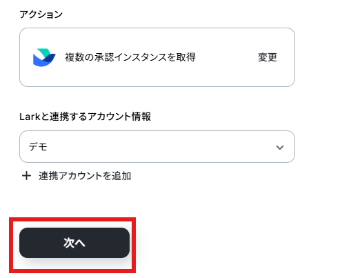 - 続けて、オペレーションでLarkの「複数の承認インスタンスを取得」アクションを設定します。