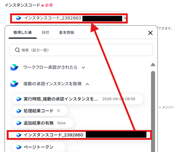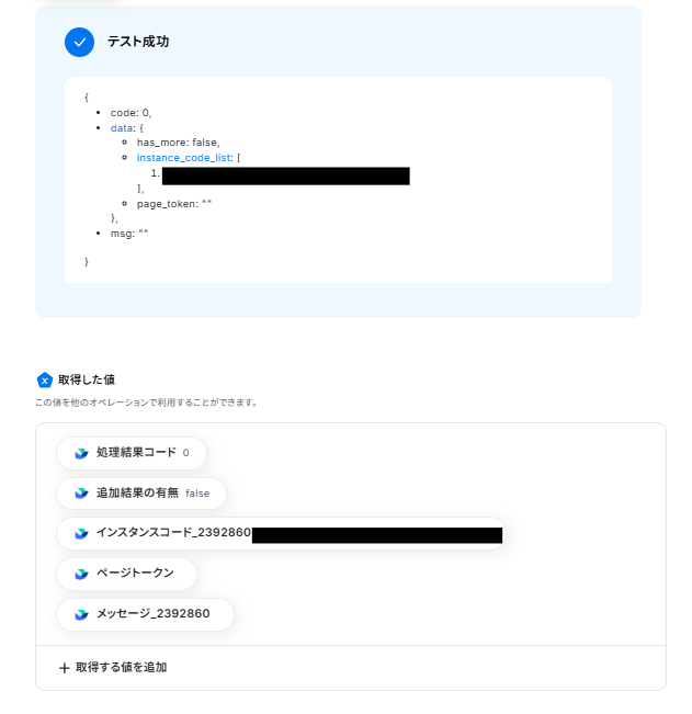 「インスタンスコード」を前ステップで取得した値から入力します。
