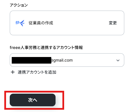 アクションはデフォルト設定のまま、アカウント情報は、連携したいアカウントが選択されているか確認してください。確認が終わったら「次へ」で進みましょう。