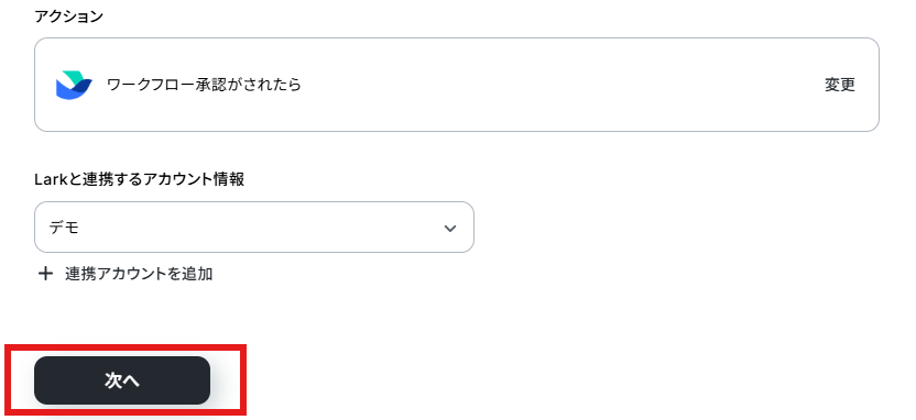 - 次に、トリガーでLarkを選択し、「ワークフロー承認がされたら」というアクションを設定します。