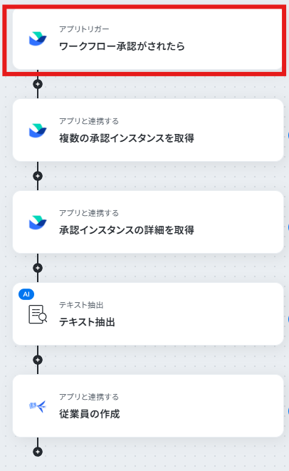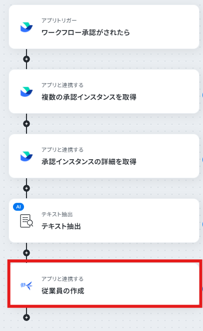 - 最後に、オペレーションでfreee人事労務の「従業員の作成」アクションを設定し、抽出した情報を基に従業員を登録します。