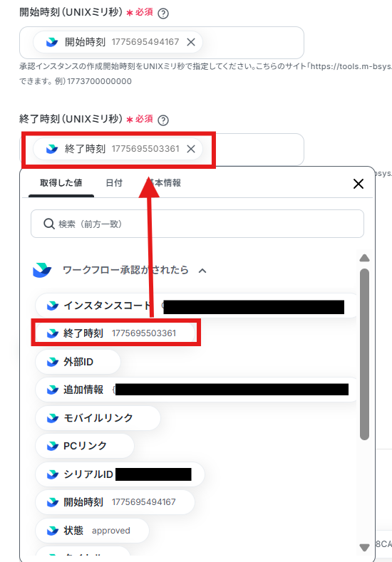 「開始時刻」と「終了時刻」を前ステップで取得した値から入力します。