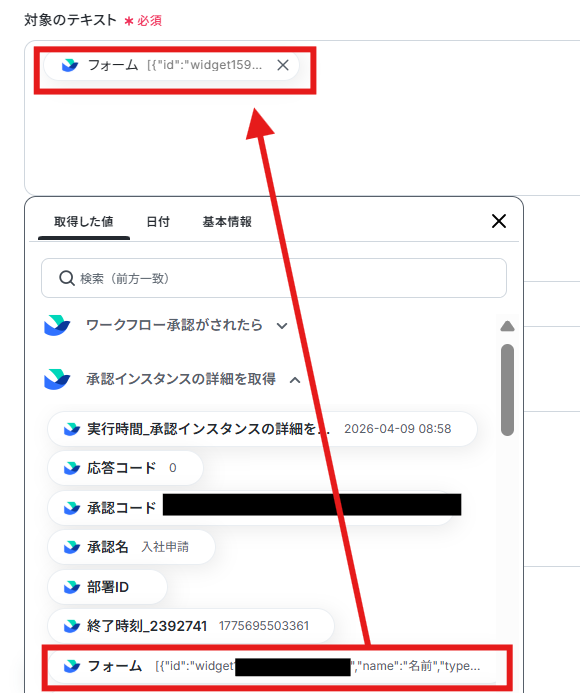 対象のテキストに「承認インスタンスの詳細を取得」の際に取得した値から、「フォーム」を入力します。