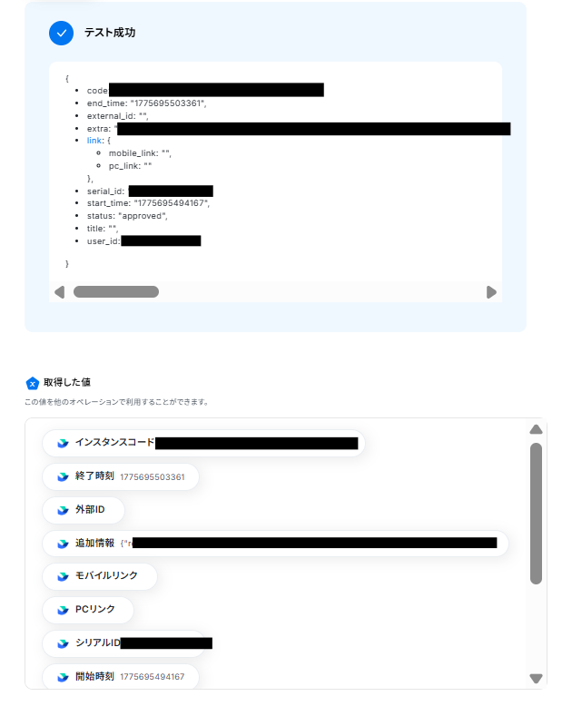 ここまで設定したらテストボタンをクリックしてください。テストが成功し、抽出された内容が取得した値に入ります。