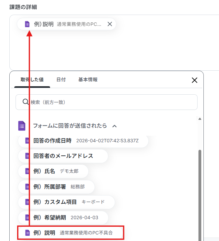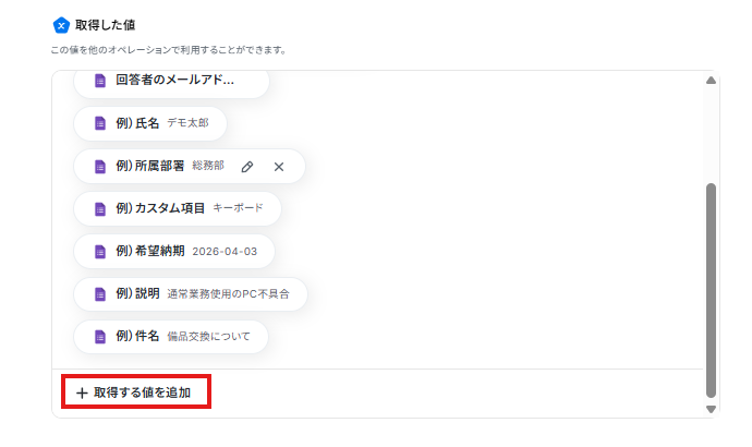 ※取得した値とは 設定時の「テスト」で取得した値のことです。後続ステップの入力値として利用でき、実行のたびに最新の内容に更新(変動)します。