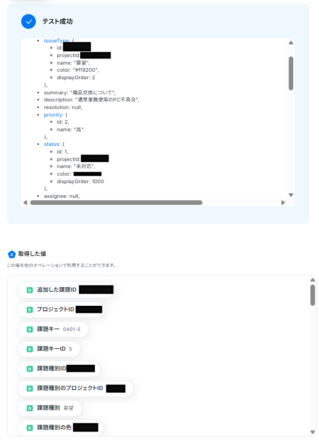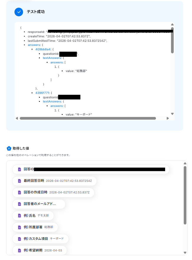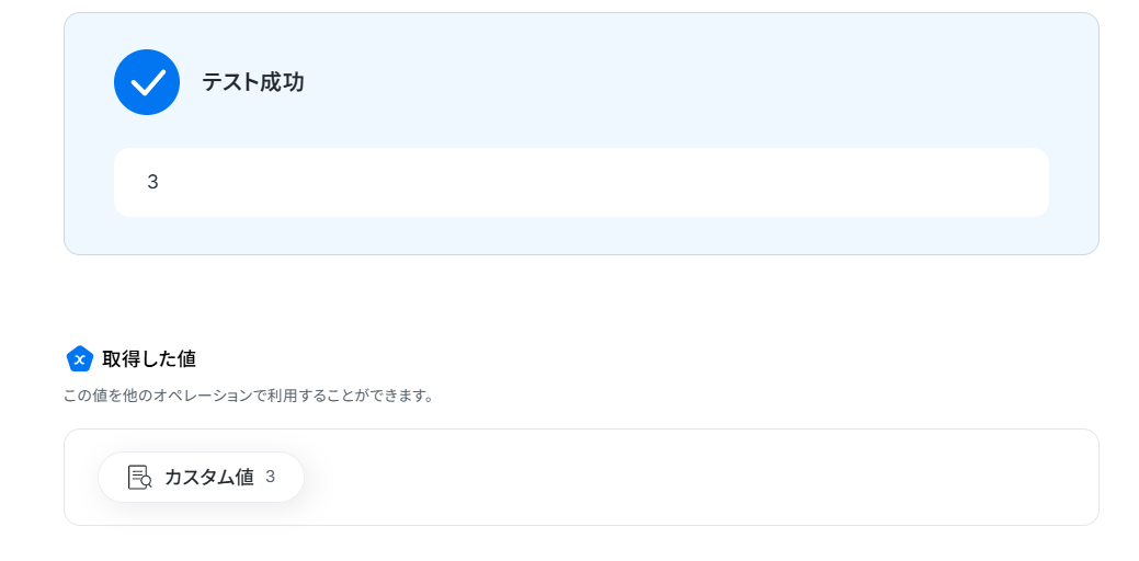 テストに成功すると、「取得した値」に情報が追加されます。