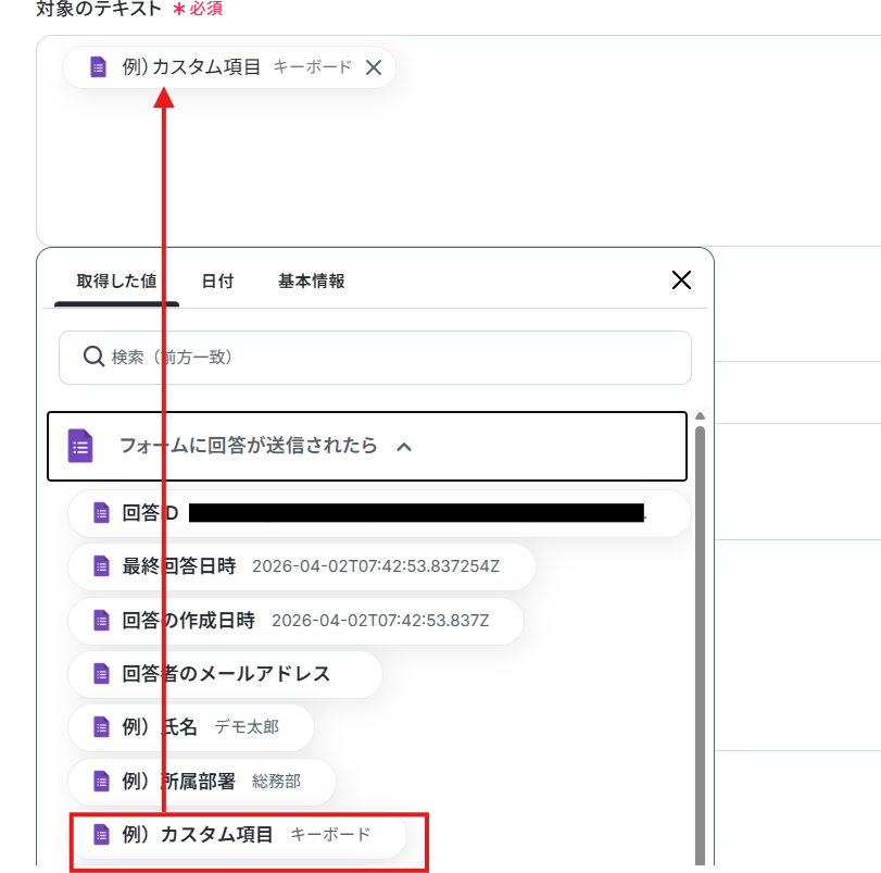 Googleフォームトリガーで、回答内容を取得する方法を参考に「取得する値を追加」から設定してください。