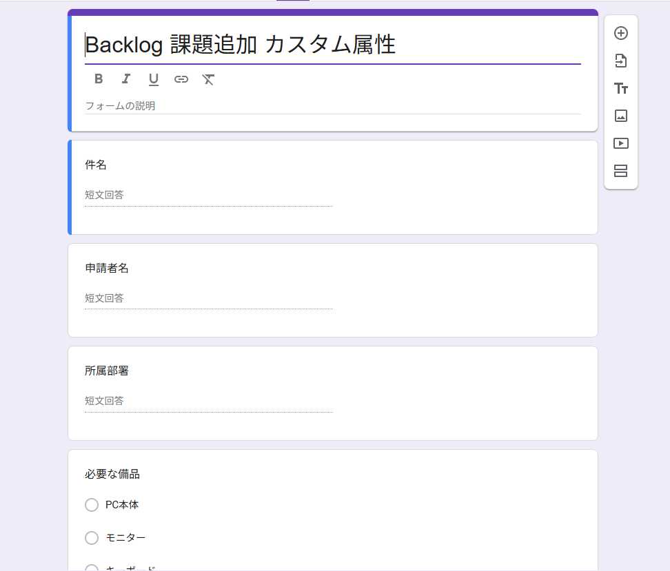 今回は各部署からの備品要請を受け付ける以下のようなフォームを作成しました。