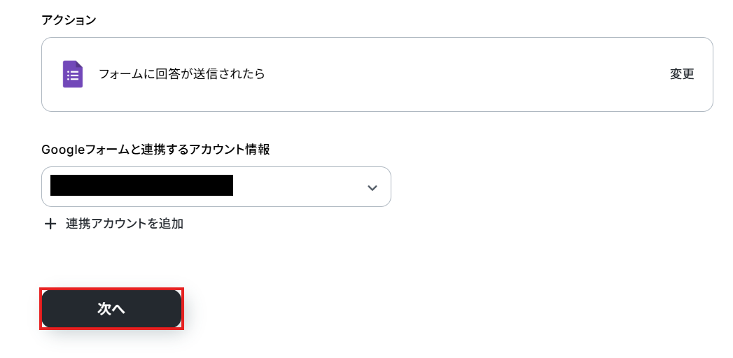 アクションは変更せず、アカウント情報がマイアプリ連携をしたアカウントと一致することを確認したら、「次へ」をクリック。