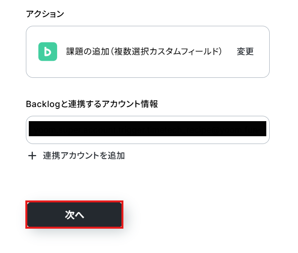 2.トリガーの「Backlogに課題が追加されたら」を選択し、連携アカウントやプロジェクトを設定してください。