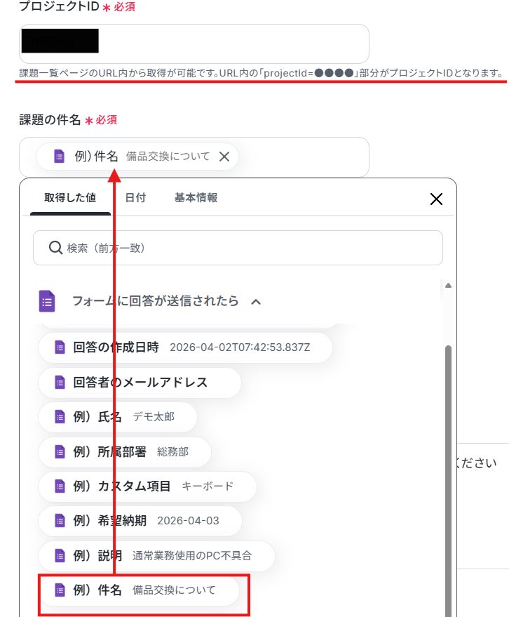 課題の件名は取得した値から設定します。