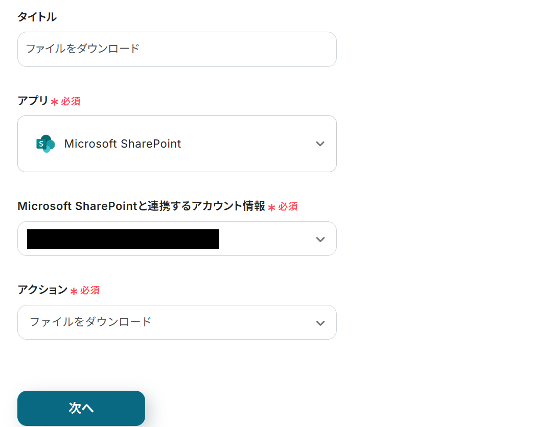 タイトルと連携するアカウント情報を任意で設定し、アクションはテンプレート通りのまま「次へ」をクリックして進んでください。