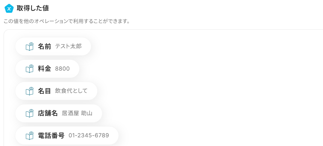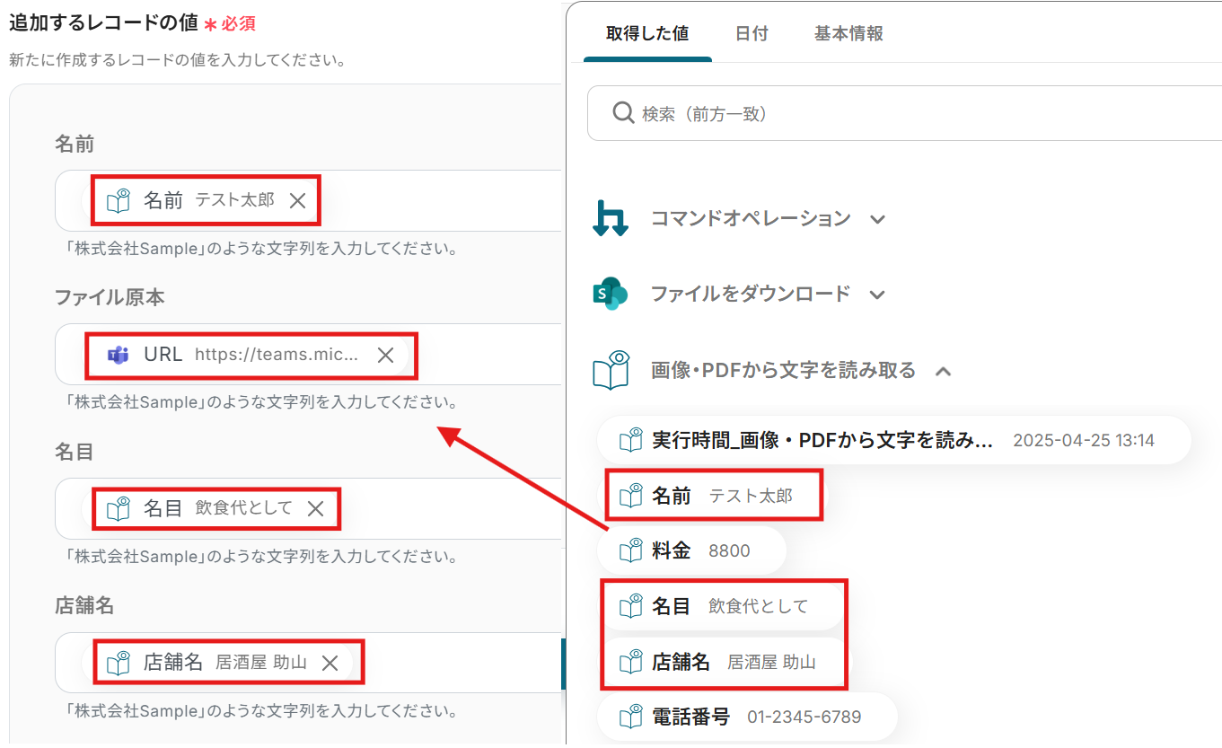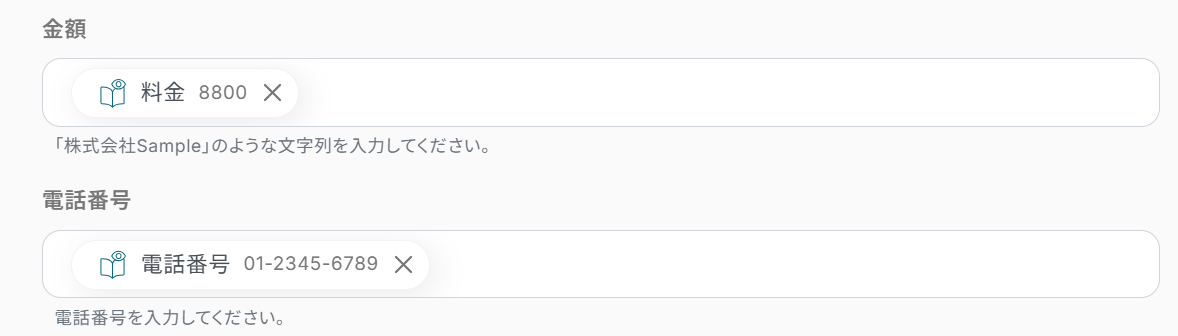 ※アウトプットから選択した項目は赤枠のように表示されます。 値を引用している印なので、これによってトリガーで取得した値をそのまま利用できます。 ここに固定の名前や金額を設定してしまうと、フロー起動時に毎回それが転記されてしまうので、アウトプットから必ず選択してください。