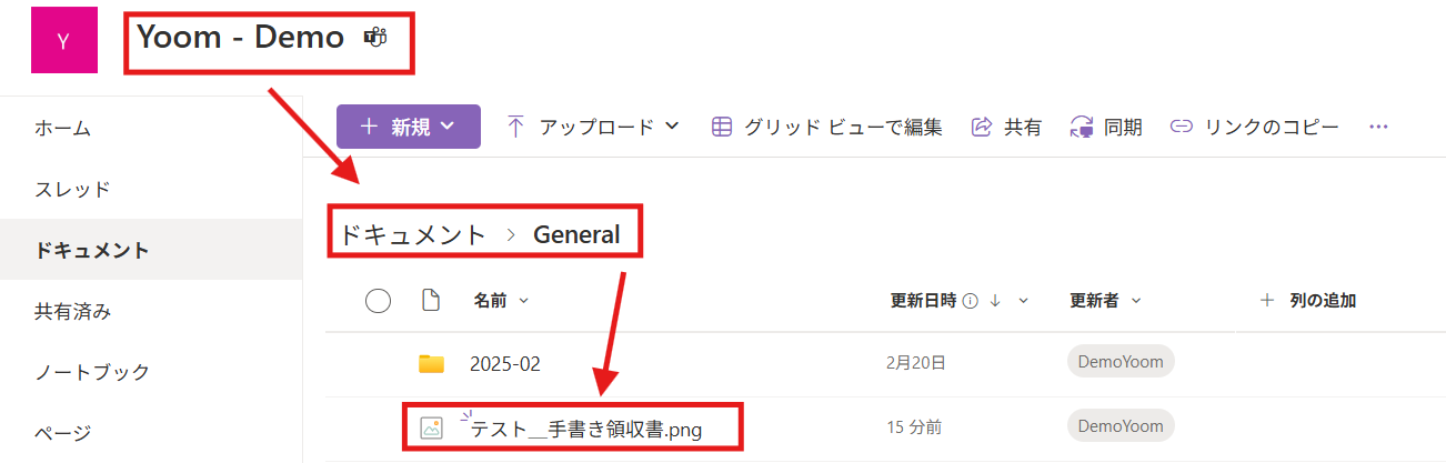 こちらのように確認できます。 今回はMicrosoft Teamsの「一般」チャネルに投稿したので、ドキュメント内「General」に添付ファイルが保存されています。