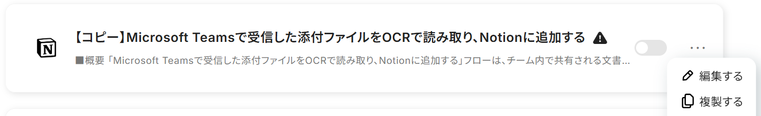 以下の画像が表示されたら、トリガーをONにしてください。 これですべての設定が完了したので、Microsoft Teamsで受信した添付ファイルをOCRで読み取り、Notionに追加されるかを確認してみましょう。