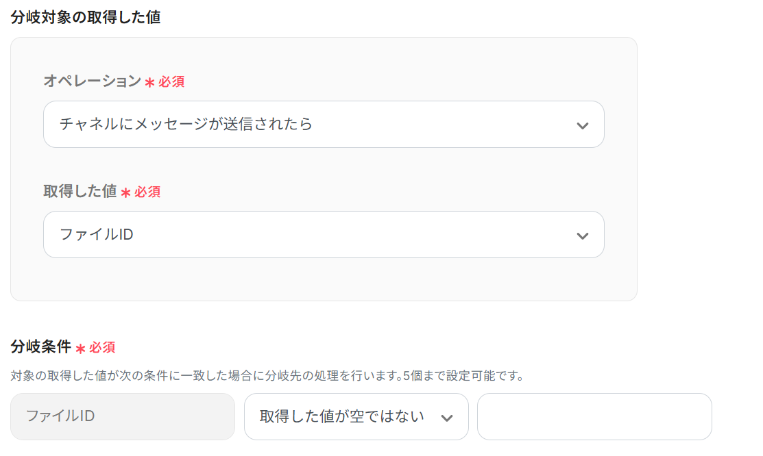 ・分岐は一部有料プラン以上で利用いただける機能(オペレーション)です。 その他の場合は設定しているフローボットのオペレーションはエラーとなるので、注意してください。