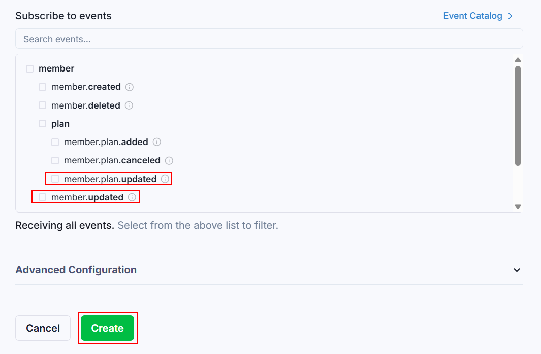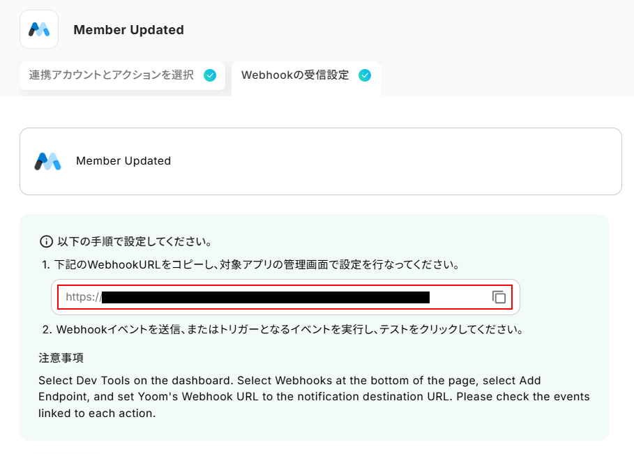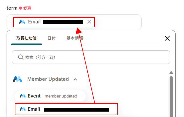 今回はMemberが更新された際に起動させたいので、以下のmember.updatedを選択しました。