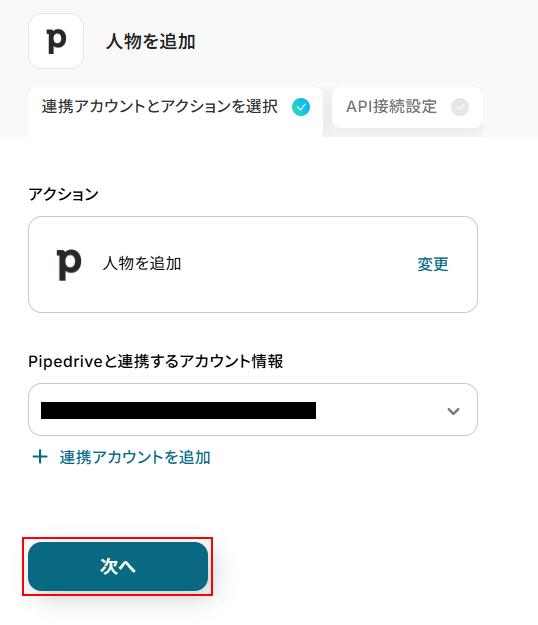 - 次に、オペレーションでPipedriveの「人物を追加」アクションを設定し、担当者名などの情報を登録します。