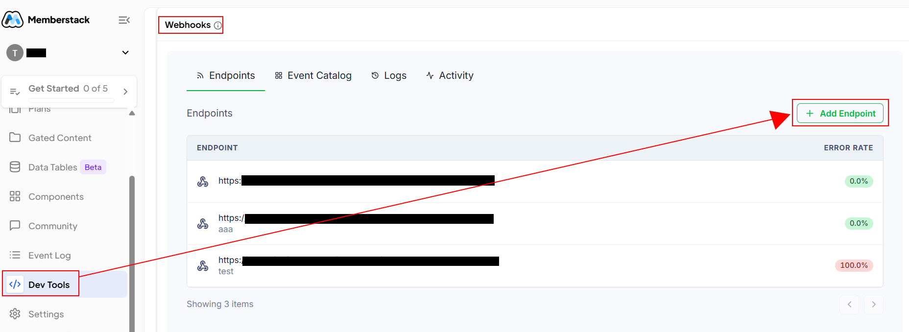 画面左にあるDev Toolsをクリックしたら下にスクロールし、Webhookの項目にある+Add Endpointをクリックします。