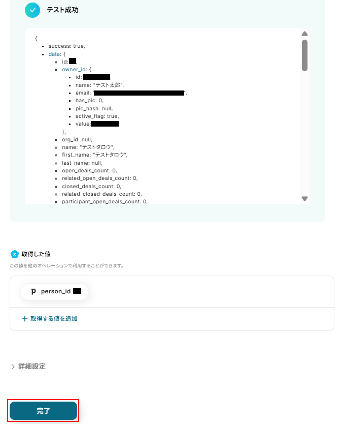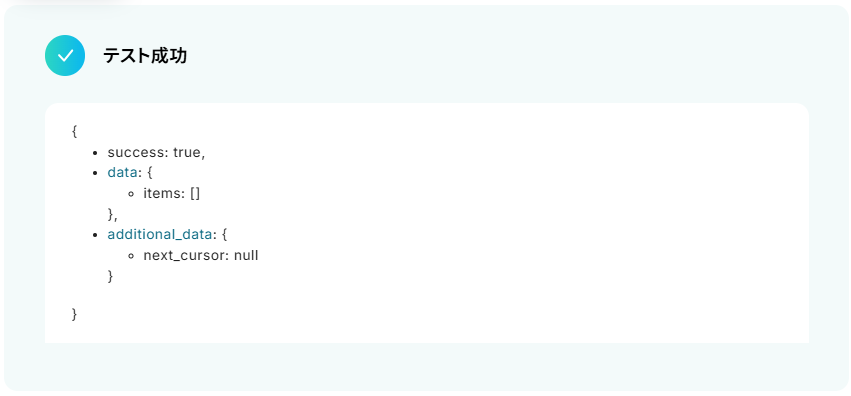 テストに成功するとテスト成功画面と取得した値が表示されますのでご確認ください。