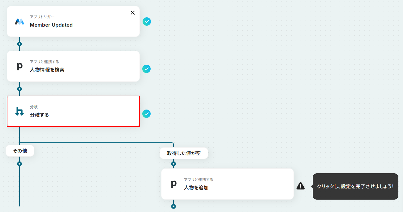 - 分岐はミニプラン以上のプランでご利用いただける機能(オペレーション)となっております。フリープランの場合は設定しているフローボットのオペレーションはエラーとなりますので、ご注意ください。