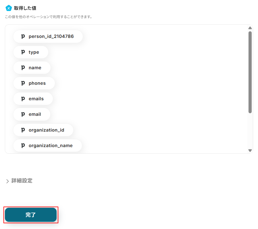 - 最後に、オペレーションでPipedriveの「人物を追加する」アクションを設定し、Memberstackから取得した情報をもとに人物を作成します。