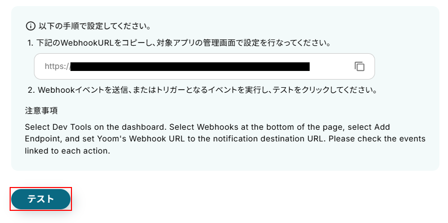 ここまで設定できたらYoomの画面に戻り、テストをクリックしましょう。