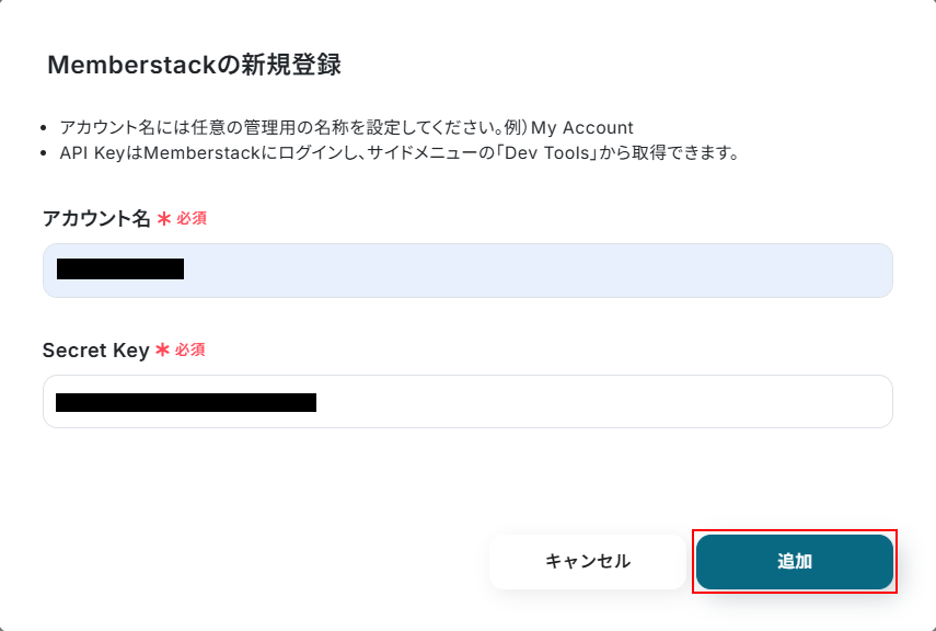 表示内容を確認し、アカウント名、Secret Keyをそれぞれ入力したら、追加をクリックします。