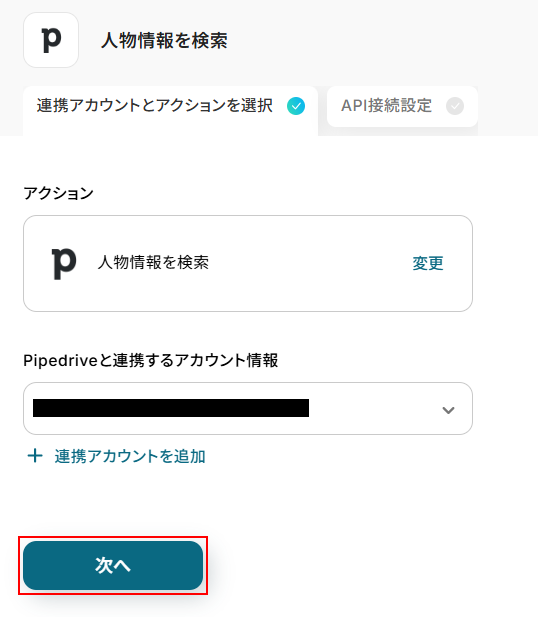- 次に、オペレーションでPipedriveを選択し、「人物情報を検索」というアクションを設定します。