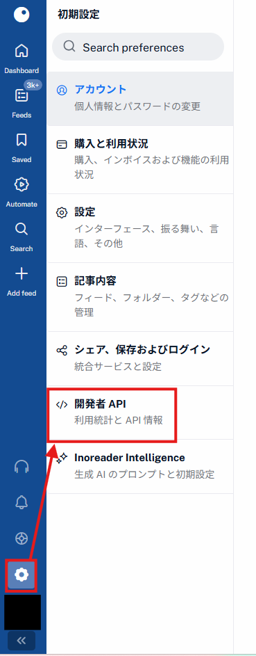 Inoreaderにログインしたら、左下の歯車 > Developer APIに進み、アプリケーションを作成しましょう。