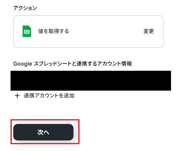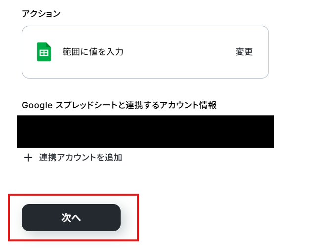 「Google スプレッドシートと連携するアカウント情報」を確認し、「次へ」をクリックして進んでください。