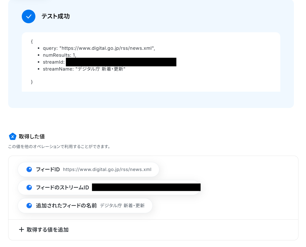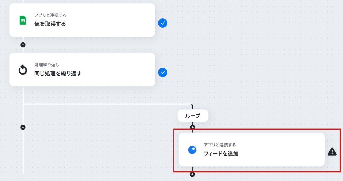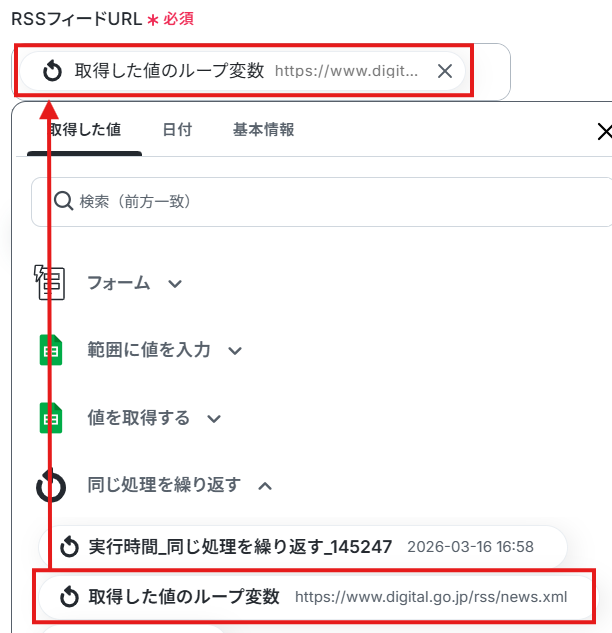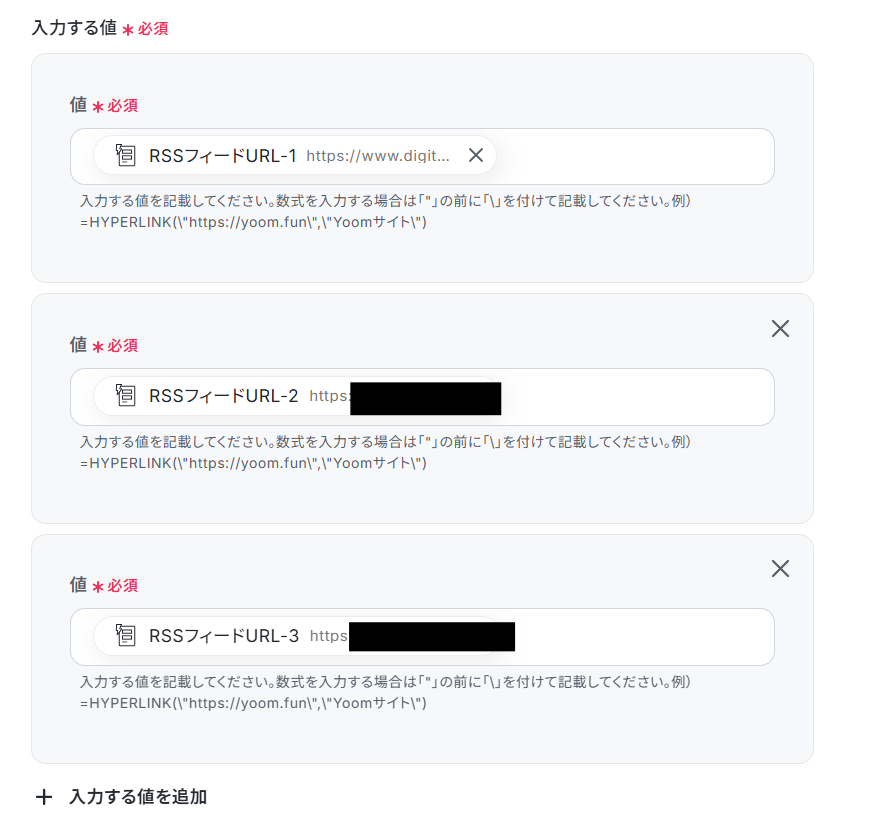 - 最後に、繰り返し処理の中でInoreaderの「フィードを追加」を設定し、各URLをフィードとして追加します。