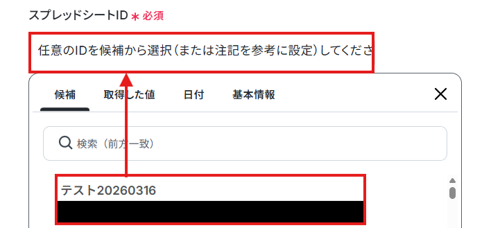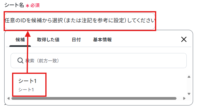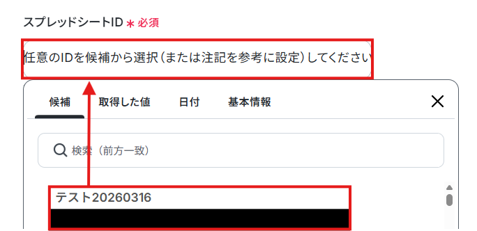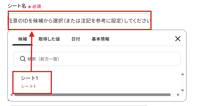 先ほど値を追加したGoogle スプレッドシートのスプレッドシートIDとシート名を候補から選択しましょう。