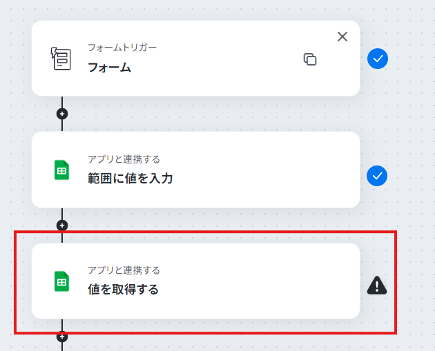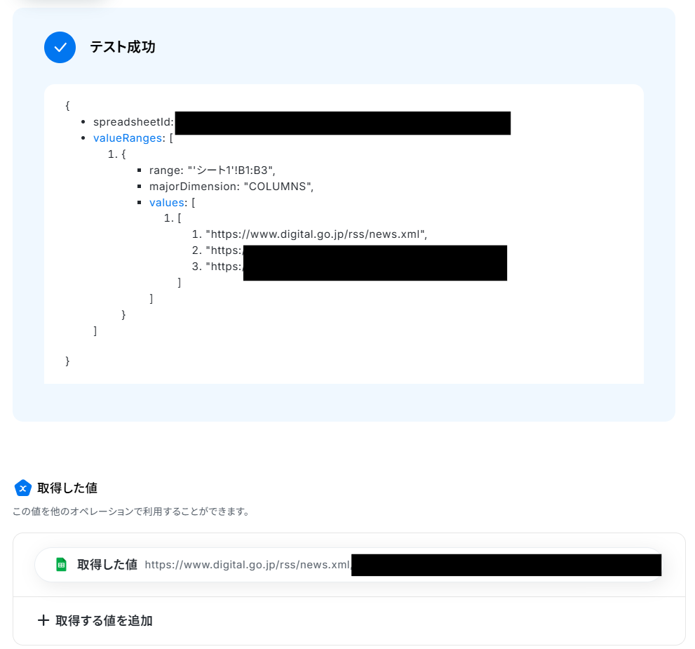 - 次に、オペレーションでGoogle スプレッドシートの「値を取得する」を設定し、書き込んだURLリストを取得します。