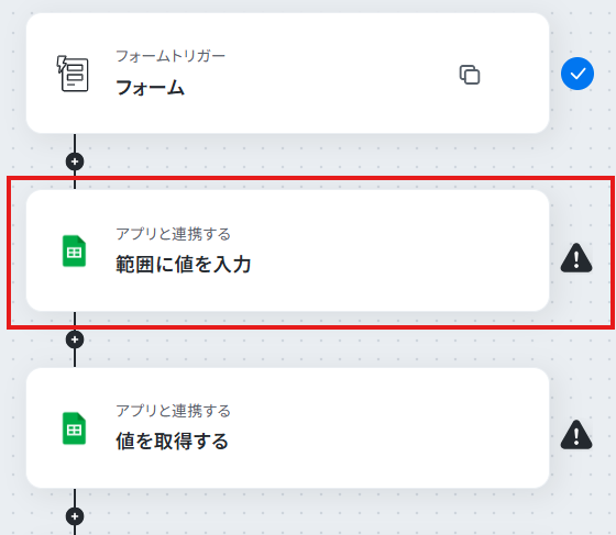 - 次に、オペレーションでGoogle スプレッドシートの「範囲に値を入力」を設定し、フォームで受け取った内容をシートに書き込みます。