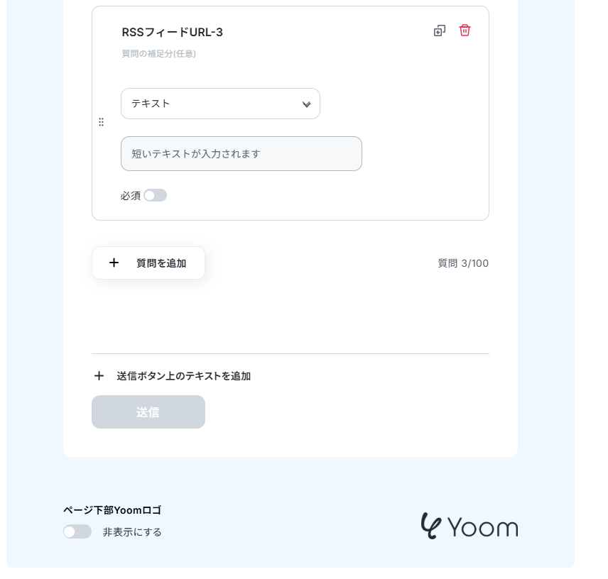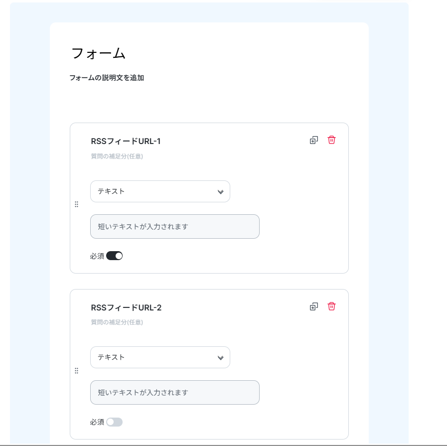 - フォームトリガーの設定では、RSSフィードのURLを受け付ける項目や回答の種別などを任意で設定してください。