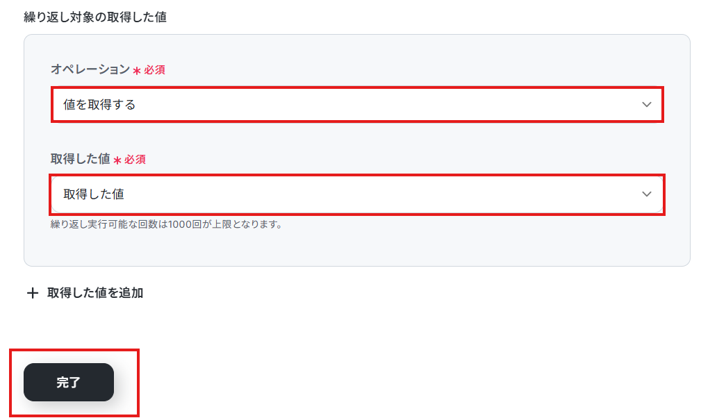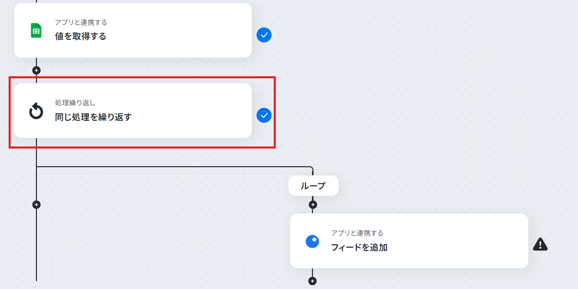 - 「同じ処理を繰り返す」オペレーション間の操作は、チームプラン・サクセスプランでのみご利用いただける機能となっております。フリープラン・ミニプランの場合は設定しているフローボットのオペレーションやデータコネクトはエラーとなりますので、ご注意ください。