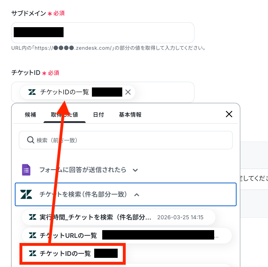 サブドメインを同じく手動で入力し、チケットIDを取得した値から選択します。