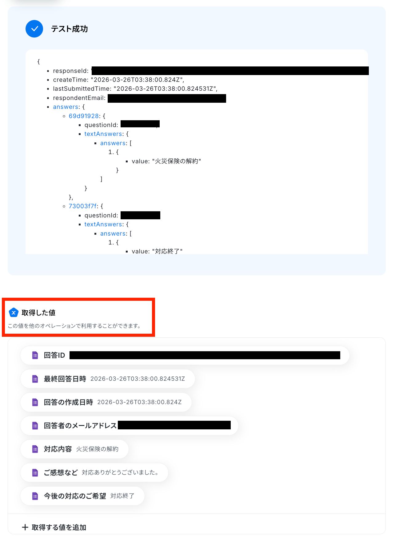 なお、取得した値に希望の値が反映されていない場合は、テスト後に、画面下部の「+取得する値を追加」を押して追加してください。詳しくはGoogleフォームトリガーで、回答内容を取得する方法をご確認ください。