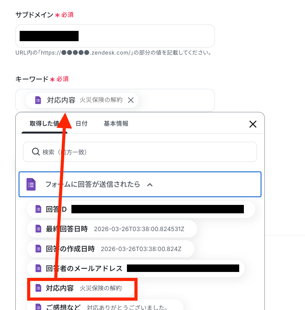 取得した値を用いて、Zendesk上のチケットを検索する設定を行います。