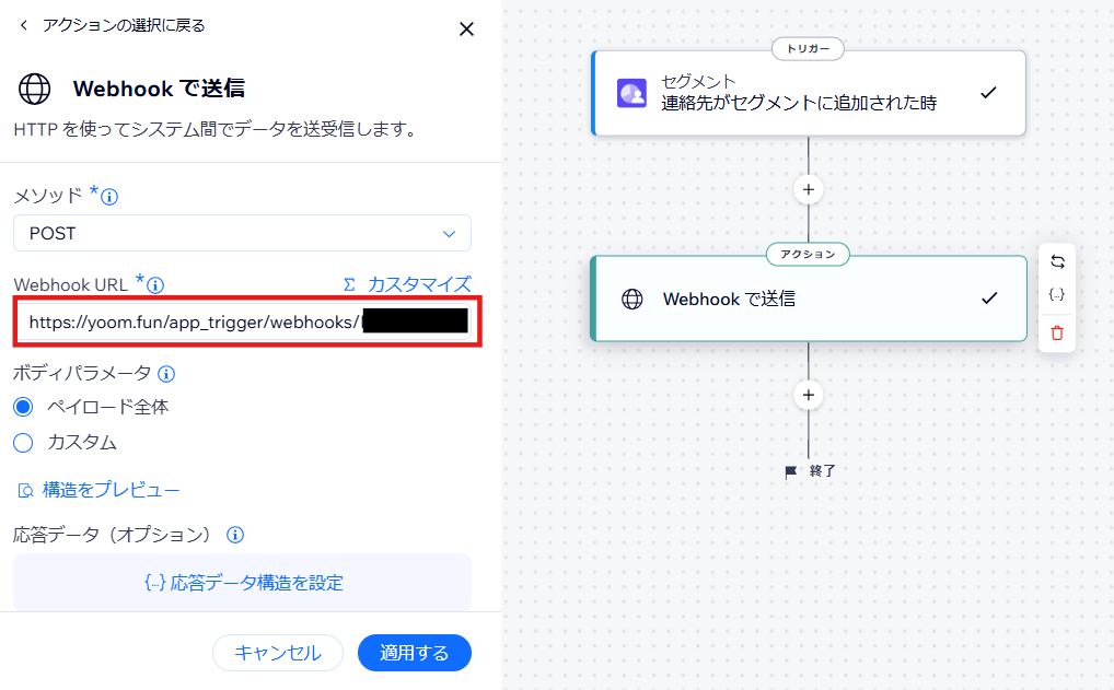 ※Wix画面のオートメーション設定で、WebhookURLを貼り付けてください。