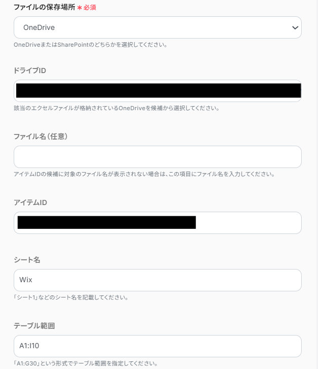 「ファイルの保存場所」はOneDriveかSharePointのどちらかを選択し、その他の項目は注釈を参考に入力します。