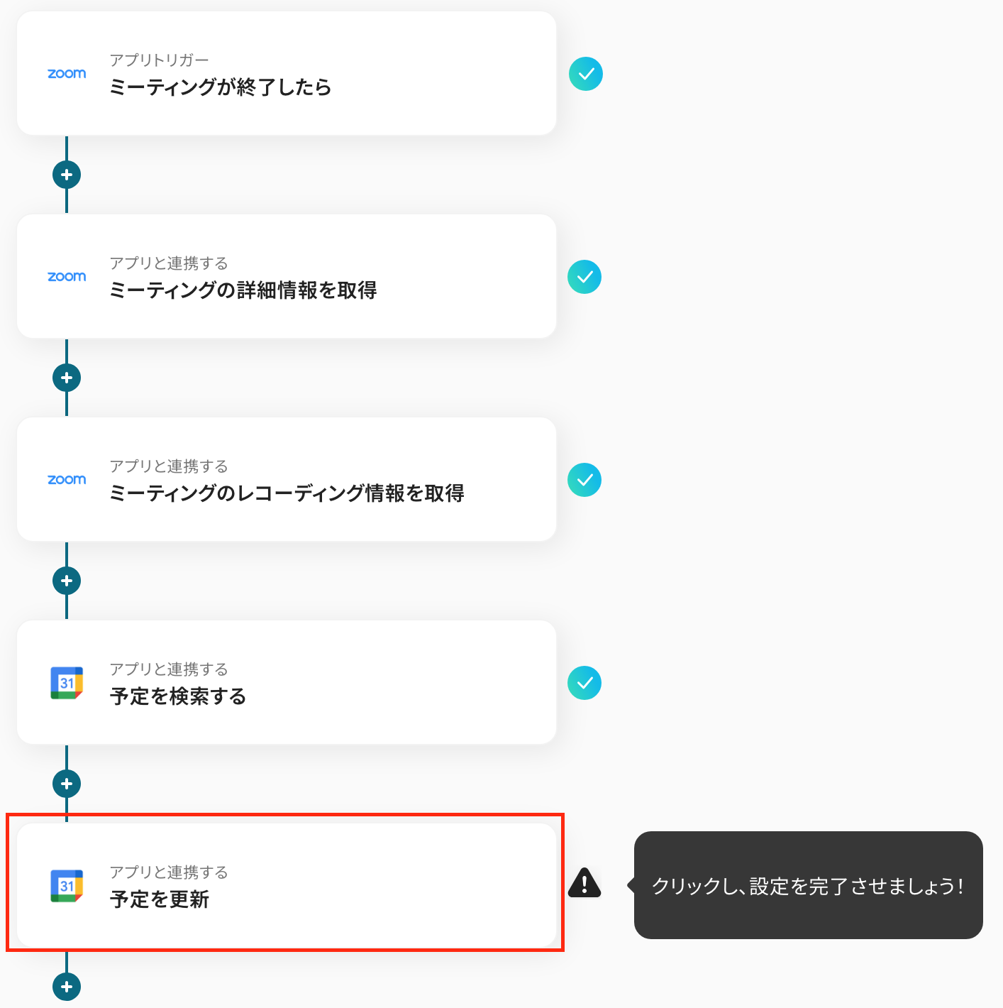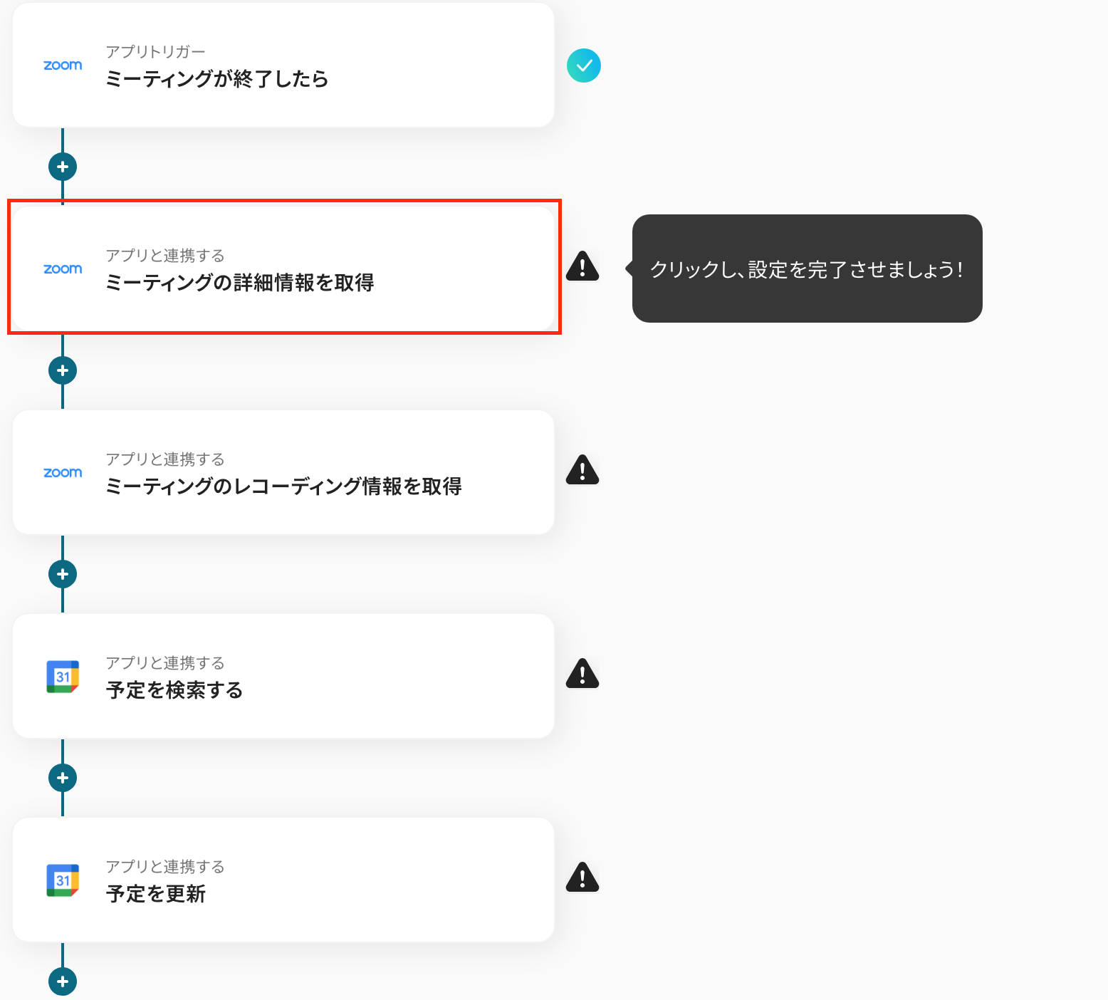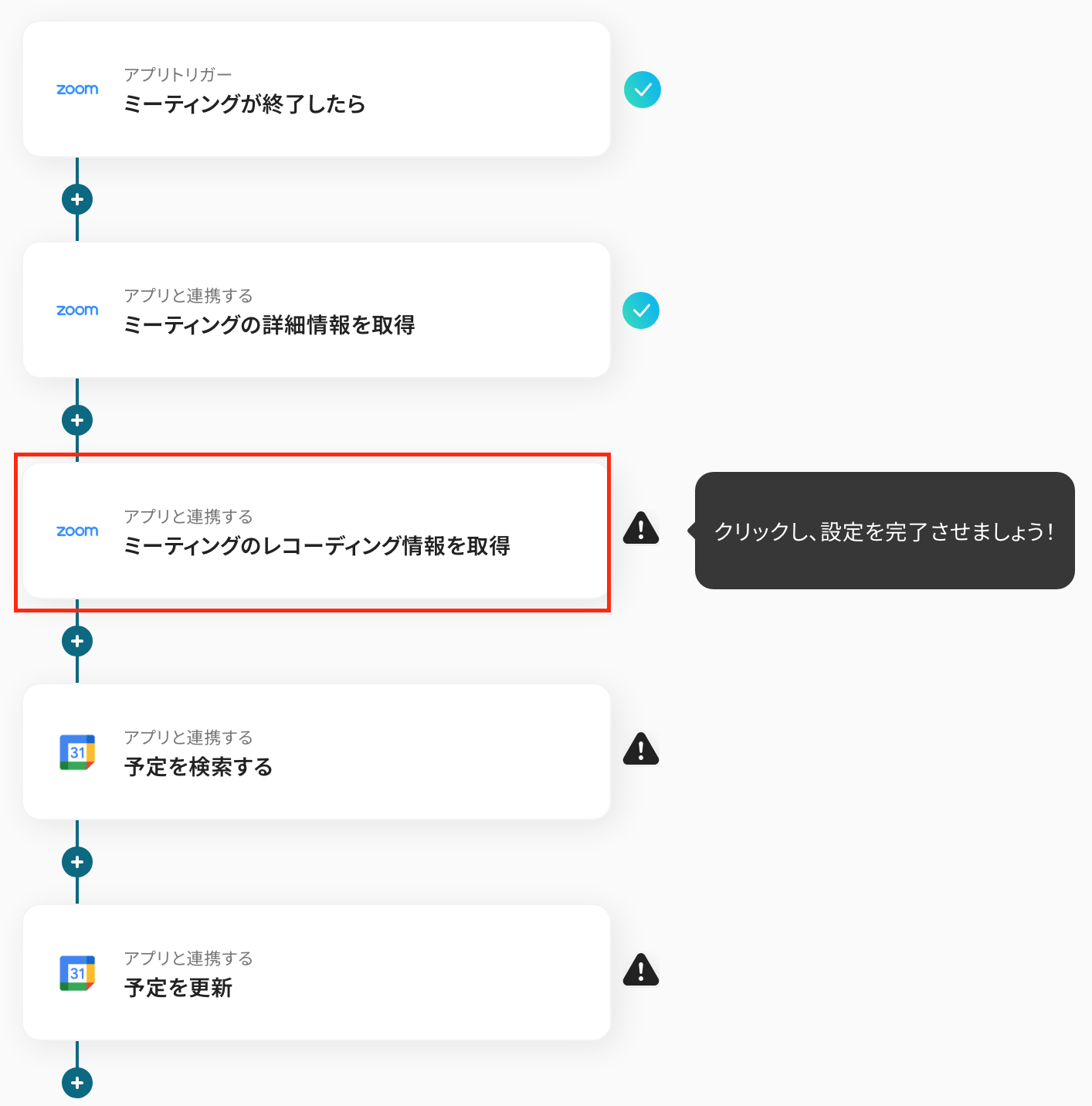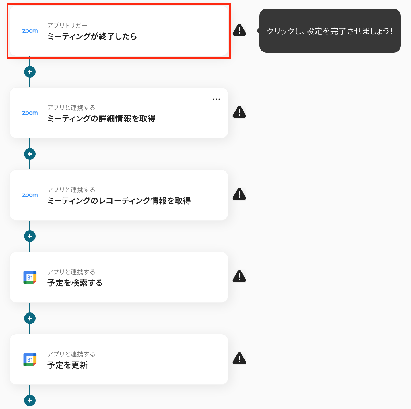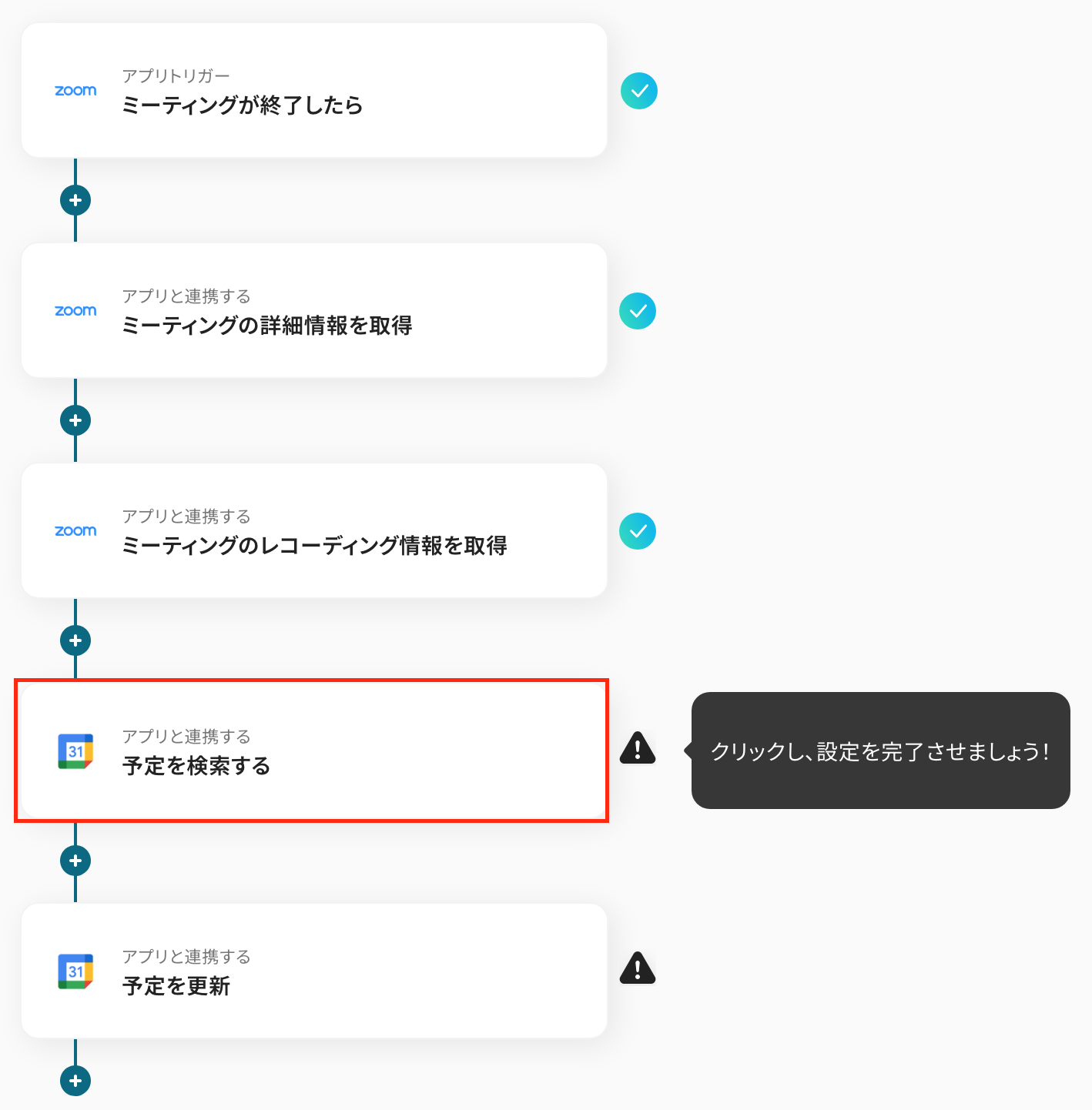 それではここから代表的な例として、Zoomミーティングが終了した際に録画リンクを自動で取得し、Googleカレンダーの該当イベントに追記するフローを解説していきます!