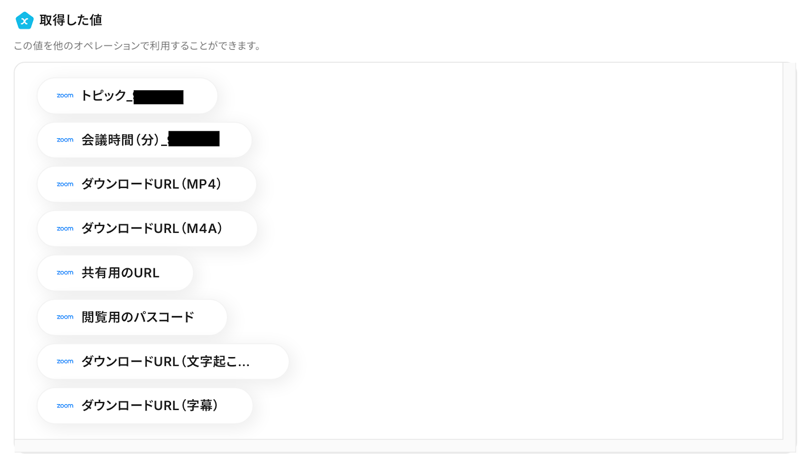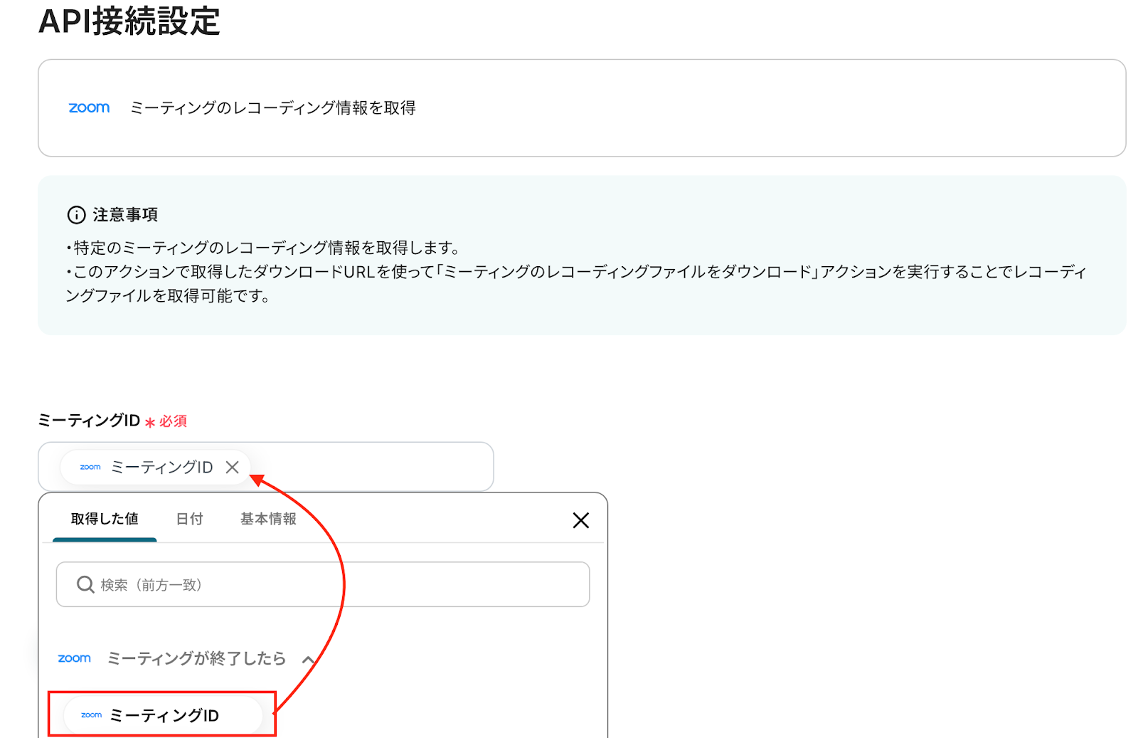 ・Zoomでミーティングのレコーディング情報を取得する際の注意点については下記をご参照ください。