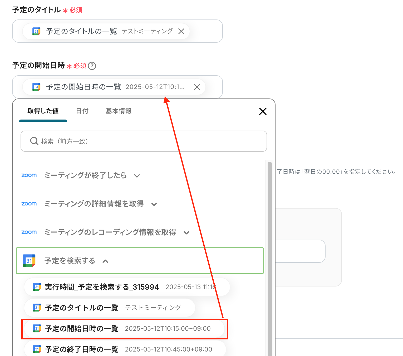 予定ID・予定のタイトル・予定の開始日時・予定の終了日時:取得した値から該当するものを選択