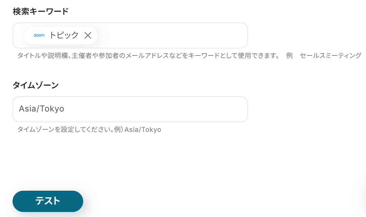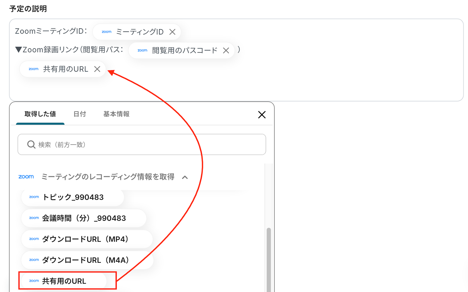 今回はデフォルトでZoomのアウトプットの「トピック」が設定されています。トピックに関連するワードがGoogleカレンダーに登録されている場合に活用できます。