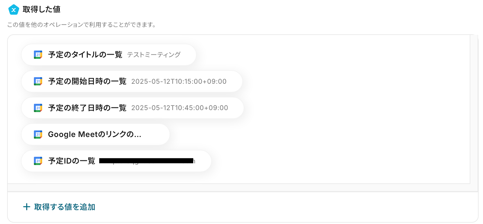 テストが成功すると、Googleカレンダーから予定情報がアウトプットとして取得されます。正しく予定情報が取得できていることを確認し、保存しましょう。